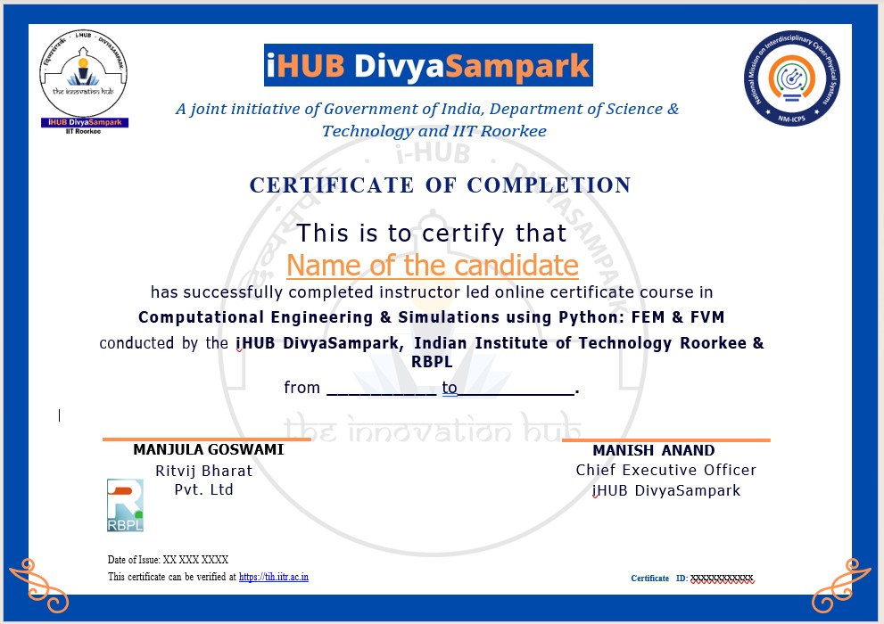 This course provides a hands-on & application-oriented knowledge on computational engineering and numerical simulations covering core techniques- Finite Element Method (FEM) and Finite Volume Method (FVM) for solving Engineering problems. This course begins with Python fundamentals with a strong focus on its libraries like NumPy & Matplotlib. It then covers numerical schemes and iterative solvers used in Computational Engineering and progressively moves on to introduce FEM formulation, element modelling, boundary conditions, and post-processing for both 1D and 2D problems, with a strong focus on implementation, physical interpretation of results, error and convergence analysis through practical, industry-relevant case studies. Finally, it introduces FVM and discusses how to develop stable and accurate solvers for diffusion, advection–diffusion, and 2D fluid flow problems with FVM using Python programming.